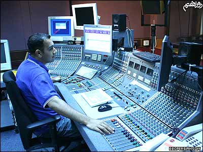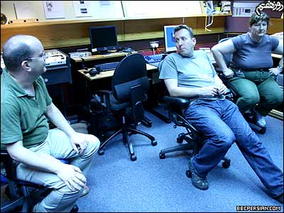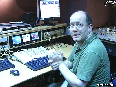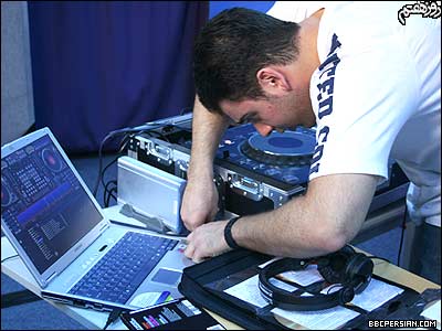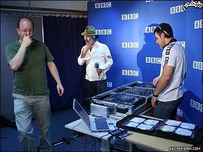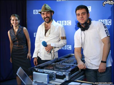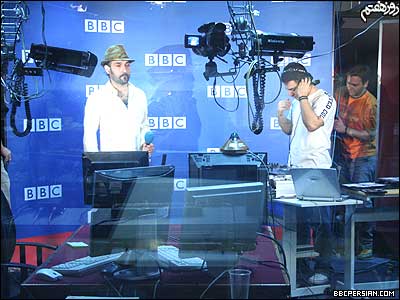 ما از یکساعت قبل از اینکه برنامه شروع بشه. نورافکنها و دوربینها و وسایل رو نصب می کنیم. به زبون انگلیسی و فارسی دعوا می کنیم و می خندیم. دی جی هم وسایل 100 کیلوئیشو می ندازه روی میز و با صدای بلند موسیقی می زاره. خلاصه اینهفته نسبتا خوب گذشت. اون عده ای هم که نشستن و دارن دیوار و نگاه می کنن، مهندسای پخشن که دارن وسط برنامه جام جهانی رو می بینن. زوبین ( کارگردان شب هفتم) هم خودش با دوربین این عکسهای آبی رنگ و گرفت و متاسفانه از دیدن جمالش محرومیم.