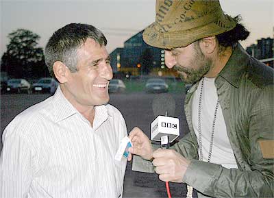خودتونو معرفی می کنين؟ من حسين عسگری هستم و از ايران برای تماشای مسابقات فوتبال به آلمان اومدم. شما همون کسی هستين که شيپور معروف تيم ملی رو بين تماشاچی ها می زنه؟ بله! من مشوق تيم ملی هستم. در چه مسابقاتی شيپور می زنين؟ هم توی ايران و هم هر کشوری که تيم ملی بازی داشته باشه، من هم باهاشون ميرم و تشويق می کنم. شما چطور اين کار رو شروع کردين؟ من در حدود ۴۳ ساله که استخدام باشگاه پرسپوليس (پيروزی) هستم و تيم ملی رو هم تشويق می کنم. خيلی جالبه. اين بوق هايی که استفاده می کنين چه جوريه؟ اين ها رو خودمون می سازيم. بوق های ۱۲ تايی و ۱۸ تايی دارم که استفاده می کنم. ۱۸ تا !؟؟؟ پس شما بايد ريه هاتون رو بيمه کنين! حقيقتش دو سه دفعه اونها روعمل کردم! شما برای بوق زدن تمرين هم می کنين؟ بعد از ۴۳ سال دیگه عادت کردم! يعنی اين حرفه شماست؟ بله.