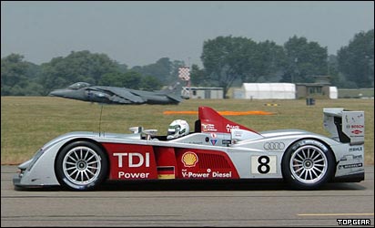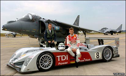 اين فکر و تصور توی سر راننده و مکانيک های آئودی هم بود تا اينکه تصميم گرفتند با Audi R10، اتومبيلی که در مسابقات له مان ۲۴ ساعته قهرمان شده بود در مقابل جت معروف 'هرير' Harrier Jump Jet مسابقه بدن.