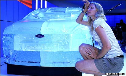 روز خيلی گرمی بود و اين نمايشگاه هم که از اول تا آخرش فقط پياده حدود يک ساعتی طول می کشيد، ديگه آخريها منو به روغن سوزی انداخته بود. 'جودی کيد' Jodie Kidd يک سوپر مدل بريتانيايی هم بود که کنار يک مدل يخی از اتومبيل جديد کروکی فورد، محيط رو خنک کرده بود. شرکت اپل Opel هم برای تبليغ مدل جديد 'کورسا' توی اون هوای گرم نوشيدنی های خنک با نام کورسا به مردم می داد.