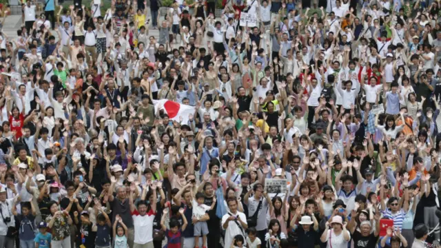 توضیح تصویر، نمایندگان ژاپن و خوشحالی شینزو آبه نخست وزیر این کشور در اجلاس بوینوس آیرس کمیته بین المللی المپیک، پس از اعلام نام توکیو به عنوان میزبان المپیک ۲۰۲۰.