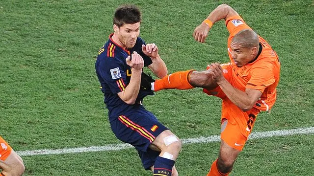 در مسابقه فینال جام جهانی ۲۰۱۰ آفریقای جنوبی بین تیم های هلند و اسپانیا، نایجل دی یانگ با لگد به سینه زابی آلونسو هافبک تیم اسپانیا کوبید. اما داور مسابقه فقط به او یک کارت زرد داد. این لگد چنان بد و خشن بود که یکی از مفسران فوتبال بی بی سی آن را "ضربه کاراته" نامید. مسابقه با تک گل آندرس اینیستا در وقت اضافی به پایان رسید و اسپانیا قهرمان جهان شد.