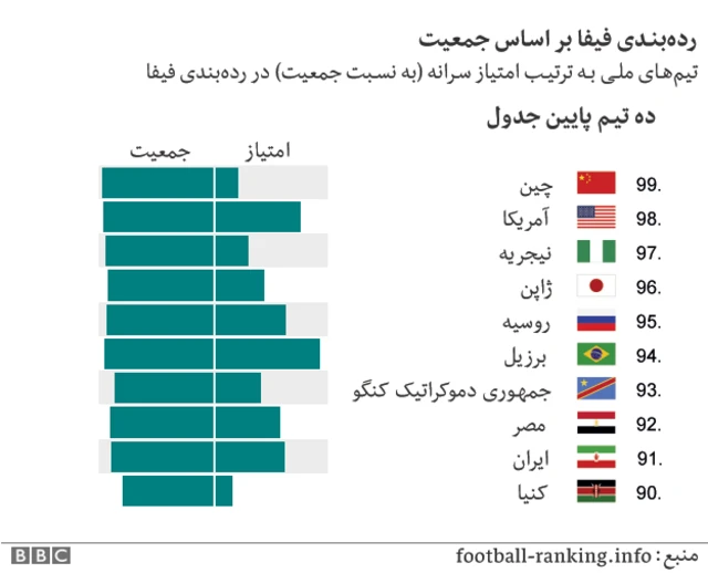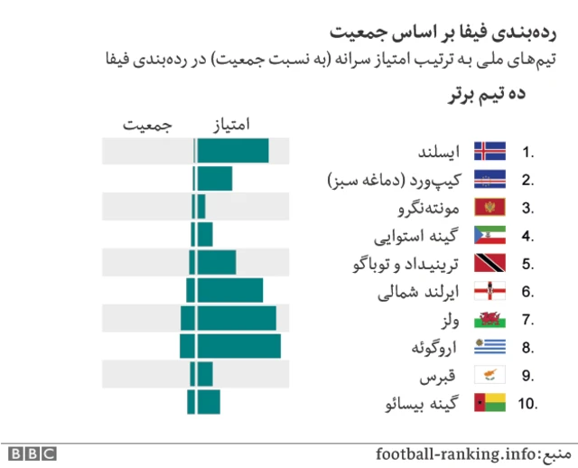 جدول زیر ردهبندی جهانی فیفا را بر اساس جمعیت کشورها نشان میدهد یعنی رتبه هر کشور در ردهبندی فیفا بر حسب سرانه جمعیت محاسبه شده است.