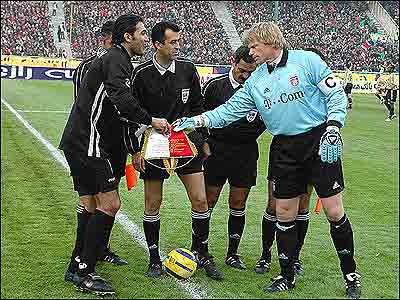 عابدزاده که در ابتدای بازی با بستن بازوبند کاپيتانی در دروازه پرسپوليس ايستاد، پس از حضوری تشريفاتی و پنج دقيقه ای، جای خود را به فرشيد کريمی، دروازه بان ديگر قرمزپوشان داد که برادرش علی کريمی با پيراهن بايرن مونيخ بازی می کرد. دروازه بان چهل ساله ايرانی سپس در حالی که از سوی بازيکنان و کادر فنی تيم سابقش، پرسپوليس بدرقه می شد و مورد تشويق تماشاگران اين تيم قرار گرفت، دور افتخار را در ورزشگاه آزادی تهران به پايان رساند و با بوسيدن چهار گوشه زمين، بازنشستگی خود را از بازی در ميادين فوتبال اعلام کرد. سه گل در يک نيمه پس از خروج عابدزاده، بازی دوستانه بين بايرن مونيخ و پرسپوليس ادامه يافت و تا پايان نيمه نخست، سه بار دروازه های دو تيم باز شد. ابتدا علی انصاريان، گل تيم ميزبان را از نقطه پنالتی به ثمر رساند اما برتری شاگردان علی پروين عمر بلندی نداشت، زيرا ميشائيل بالاک با ضربه سر گل تساوی تيمش را وارد دروازه پرسپوليس کرد. در دقايق پايانی نيمه اول نيز (دقيقه 44) پائولو گوئررو گل ديگری برای تيمش زد. نيمه دوم اين مسابقه گلی دربر نداشت، ولی پرسپوليس بهتر از بازيهای داخلی مقابل حريف آلمانی خود ظاهر شد. برگزاری اين بازی بدليل برف و سرمای شديد در تهران با ترديدهايی روبرو بود. اما مقامات ورزش ايران تاکيد کرده بودند که تمام تلاش خود را برای آماده کردن زمين بکار خواهند گرفت. در بين دو نيمه ديدار از دو بازيکن ديگر تيم پرسپوليس، علی دايی و کريم باقری نيز تجليل شد. علی دايی، کاپيتان تيم ملی ايران اکنون در باشگاه صباباتری بازی می کند و کريم باقری همچنان با پيراهن پرسپوليس در ليگ برتر ايران به ميدان می رود. آخرين وداع با "عقاب آسيا" ديدار دوستانه روز جمعه، آخرين حضور دروازه بانی بود که در سالهای اوجش از سوی هواداران فوتبال ايران، "عقاب آسيا" نام گرفته بود. عابدزاده در گفتگويی با بی بی سی ضمن تشکر از مسئولان پرسپوليس که اين ديدار را برگزار کردند و مردمی که با تشويقهايشان به او "انرژی دادند" گفت: "امروز يکی از بهترين روزهای زندگی من بود." او پيشنهاد کرد که چنين برنامه هايی برای ساير بازيکنان صاحب نام و قديمی ايران هم انجام شود. احمد رضا عابدزاده آخرين بازی ملی خود را در 25 ژوئن 1998 مقابل تيم ملی فوتبال آلمان در چارچوب بازی های جام جهانی فرانسه انجام داده بود. او که در هر دو تيم پرطرفدار تهرانی، پرسپوليس و استقلال، بازی کرده است، نخستين بار در سال 1987 هنگامی که در تيم تام اصفهان عضويت داشت توسط پرويز دهداری به تيم ملی ايران دعوت شد و در فوريه همان سال در پيروزی دو بر يک ايران مقابل کويت سهيم شد. مهمترين افتخارات بين المللی عابدزاده، علاوه بر راه يافتن به جام جهانی و حضور در دو بازی دور نهايی اين جام در فرانسه، همچنين شامل قهرمانی در بازيهای آسيايی 1990 می شود. مربيگری تيم ايران در بازيهای آسيايی پکن را نيز علی پروين برعهده داشت. افتخارات باشگاهی او نيز شامل چهار قهرمانی با پرسپوليس و دو قهرمانی با استقلال در ليگ فوتبال ايران و قهرمانی جام باشگاههای آسيا در سال 1990 همراه با استقلال تهران است. احمد رضا عابدزاده، همچنين تنها دروازه بانی است که 760 دقيقه دروازه خود را در بازيهای ليگ فوتبال ايران بسته نگه داشته است. نظرات شما اگر پرسپوليس در بازيهای ليگ هم اينچنين با انگيزه و منظم بازی ميکرد هيچ تيمی توانايی مقابله با پرسپوليس را نداشت حتی حريف ديرينه اين تيم يعنی استقلال. من دليل ناکاميهای پرسپوليس را در نبود يک سيستم مديريتی مشخص و مقتدر در راس اين باشگاه می بينم که مسبب اصلی آن سازمان تربيت بدنی می باشد چرا يک تيم با اين همه تماشگر بايد به اين روز بيافتد. محمد رضا - تهران عابدزاده خاطره بچگی من است. يادم مياد قديما که هنگام بازی گل کوچيک توی دروازه می استاديم ميگفتيم: من عابدزاده ام! عقاب آسيا هيچ وقت يادم نمی رود بازی با استراليا در ملبورن که توپ را يک دستی گرفت. شگرد عقاب همين کارهای نمايشی و بعضا خطرناک بود ولی همين