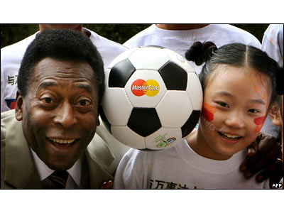 پله افسانه برزيلی فوتبال جهان همراه دختر چينی در مراسمی برای اعطای بليت های افتخاری جام جهانی فوتبال آلمان در شانگهای چين حضور پيدا کرد.
