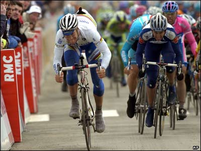در اولين مرحله از مسابقات دوچرخه سواری بين پاريس تا نيس، تام بونن از بلژيک(چپ) به مقام اول رسيد.