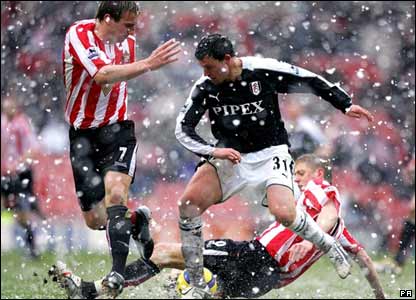 مسابقه فوتبال بين دو تيم فولهام و ساندرلند، از سری مسابقات ليگ برتر انگلستان، به علت بارش برف سنگين، 21 دقيقه پس از شروع به دستور داور خاتمه يافت.