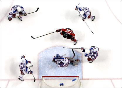 مسابقه هاکی روی يخ بين دو تيم نيويورک رنجرز و نيوجرزی دويلز در نيوجرزی