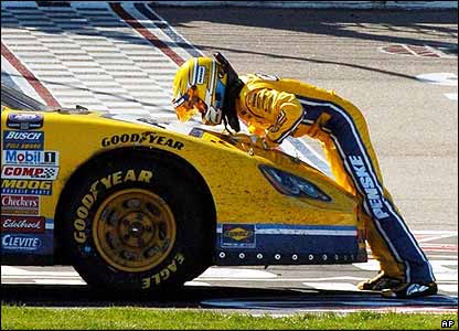 کرت بوش، با بوسه ای بر اتومبيلش، از او به خاطر همراهی تا مقام اول در مسابقه NASCAR تگزاس تشکر می کند.