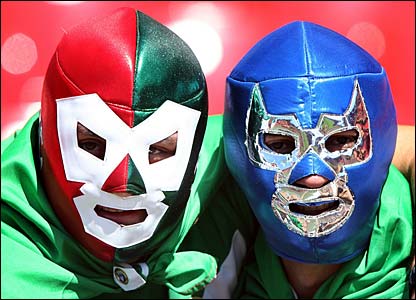 دو طرفدار ماسکدار تيم مکزيک خود را برای بازی ايران و مکزيک آماده می کنند