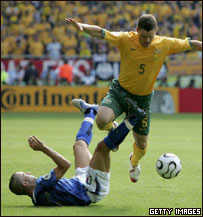 تا سال 2002 فقط سه تيم برزيل، آرژانتين و فرانسه توانسته بودند ايتاليا را از جام جهانی حذف کنند. اما در سال 2002 اين تيم مغلوب کره جنوبی يک از دو برگزار کننده جام جهانی شد و از گردونه مسابقات بيرون رفت. ايتاليا در 22 بازی ملی گذشته اش شکست نخورده و از اين لحاظ رکورددار است. آخرين شکست اين تيم به بازی با اسلوونی در مرحله انتخابی جام جهانی در اکتبر 2004 باز می گردد. اين تيم که در گروه E مسابقات با تيمهای غنا، آمريکا و جمهوری چک همگروه بود با دو پيروزی و يک تساوی با 7 امتياز صدرنشين اين گروه شد. تيم ملی استراليا در دومين حضور خود در جام جهانی موفق شد برای نخستين بار از گروهش صعود کند. نخستين حضور استراليا در جام جهانی، بازيهای 1974 بود که آن هم در آلمان (غربی) برگزار شد. استراليا تنها کشور تاريخ جام جهانی است که توانسته در 7 دقيقه پايانی يک مسابقه 3 گل به ثمر برساند. اين رکورد زمانی ثبت شد که استراليا در نخستين ديدارش در گروه F مقابل ژاپن به ميدان رفت و تا دقيقه 84 يک بر صفر از حريف عقب بود. سه گل پياپی در دقايق پايانی سرنوشت ديگری برای اين بازی رقم زد. اين تيم با شکست دادن ژاپن، شکست در مقابل برزيل و تساوی با کرواسی با چهار امتياز پس از تيم برزيل به يک هشتم نهايی صعود کرد. ترکیب اصلی دو تیم: ايتاليا: بوفون، زامبروتا، ماتراتسی (اخراج)، کاناوارو، گروسو، گاتوسو، پيرلو، پروتا، دل پيرو (توتی 74)، تونی (بارزايلی 51)، جيلاردينو (اياکوينتا 46). استراليا: شوارتسر، برشيانو، نيل، مور، چيپرفيلد، گرلا، کولينا، کائيل، استريوفسکی، ويلکشاير، ويدوکا. |