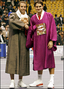 سمپراس و فدرر پیش از مسابقه در زمین تنیس استادیوم المپیک سئول سرتاپا (بجز کفش ورزشی) لباس سنتی کره را بر تن داشتند.