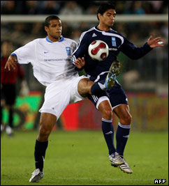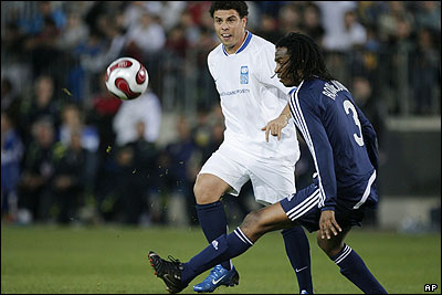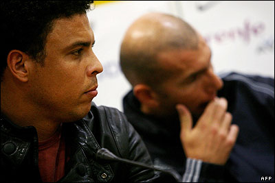 ژولیوس دوس سانتوس، در حال دفاع زیدان که در دقیقه 11 گل اول مسابقه را به ثمر رساند. دوس سانتوس خود در دقیقه 61 گل اول تیم رونالدو را زد.