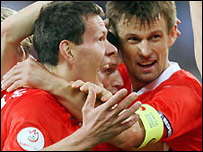 زمان: ساعت 18:45 به وقت گرینویچ (23:15 به وقت تهران) مکان: اتریش، شهر سالزبورگ یونان که چهار سال قبل در اقدامی تحسین برانگیز با شکست دادن پرتغال در فینال دور قبل جام ملتهای اروپا به قهرمانی رسید، به عنوان یکی از ضعیف ترین تیمهای جام سیزدهم از صعود به مرحله بعد بازماند. یونان که در بازی اول خود مقابل سوئد نتوانست ثبات کند که اراده ای برای کسب پیروزی دارد، در بازی دوم هم به واسطه فقدان جاه طلبی در حمله، بهای سنگینی پرداخت کرد. آنجلوس کریستئاس که با زدن گل پیروزی مقابل پرتغال به یک قهرمان تبدیل شده بود، مقابل روسیه بهترین موقعیت ممکن برای گل زنی را در دقیقه 19 از دست داد. آنجلوس باسیناس کاپیتان یونان توپ بلندی را بر روی دروازه روسیه ارسال کرد که برای ورود به دروازه به تنها یک ضربه سر ساده نیاز داشت، اما کاریستئاس در زدن این ضربه ناکام ماند. روسیه با استفاده از این شرایط در دقیقه 39 ضربه خود را وارد کرد. نیکوپولیدیس دروازه بان یونان، به نحوی غیرقابل توضیح، توپی را که به نظر نمی رسید تهدیدی جدی بر روی دروازه این تیم ایجاد کرده به سمت راست دروازه و در امتداد خط عرضی دنبال کرد و از دروازه خارج شد. این اقدام به سمک بازیکن روسیه امکان داد تا توپ را به میانه منطقه شش قدم باز گرداند. پس از آن نیکوپولیدیس با حسرت شاهد آن بود که دروازه خالی او توسط ژیریانف فتح شود و تنها گل بازی به ثمر برسد. هر چند در آغاز نیمه دوم روسیه بازی را در اختیار داشت اما در میانه این نیمه یونان، هر چند بی حاصل، ناگهان بیدار شد و حملاتی را پایه ریزی کرد. با این حال یونان زهر سال 2004 را نداشت و به عنوان تنها تیم حاضر در تورنمنت که در دو بازی گلی به ثمر نرسانده، از صعود به مرحله بعد بازماند. یونان چهارمین قهرمان اروپا است که در دور بعدی مسابقات نتوانسته از مرحله گروهی صعود کند. روسیه که با پیروزی مقابل یونان، صدر نشنین اسپانیا را تضمین کرد، در روز چهارشنبه برای تعیین تکلیف تیم دوم صعود کننده از گروه D، با سوئد دیدار خواهد کرد. هرچند سوئد برای صعود به تنها یک مساوی نیاز دارد، اما روسیه باید سوئد را شکست دهد. |
