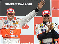 لویس همیلتون با درخشش و پیروزی در گراندپری آلمان در صدر جدول رانندگان رقابتهای فرمول یک، چهار امتیاز از نزدیک ترین رقیب خود فاصله گرفت. این راننده تیم مکلارن-مرسدس که رتبه اول زمانگیری را کسب کرده بود، اولین مسابقه نیم فصل دوم را جلوتر از سایر رقبا آغاز کرد و به راحتی از سایر رانندگان فاصله گرفت، اما تصمیم بحث برانگیز تیم مکلارن برای استفاده نکردن از حضور اتومبیل ایمنی (مارشال) در پیست در میانه مسابقه باعث ایجاد تردید در احتمال پیروز او در مسابقه شد. او که پیش از مسابقه هم سطح کیمی رایکونن و فیلیپه مسا، رانندگان تیم فراری، 48 امتیاز داشت، پس از آخرین نوبت سوختگیری و تعویض لاستیک به مکان پنجم تنزل یافت. اما هایکی کووالاینن، هم تیمی او، شرایط سبقت گرفتن را برای همیلتون فراهم کرد، و پس از آن این راننده بریتانیایی توانست با سبقت گرفتن از فیلیپه مسا و نلسون پیکه راننده تیم رنو، در مقام اول از خط پایان عبور کند. فراری رو به پایین پیست هاکنهایم آلمان صحنه لغزش فراری بود. هر چه در گراندپری بریتانیا فیلیپه مسا در کنترل اتومبیل خود در هوای بارانی مشکل داشت، در آلمان کیمی رایکونن قادر به مهار کردن "شیطان قرمز" نبود، که این موضوع تعجب مفسران تلویزیونی و کارشناسان را برانگیخت.