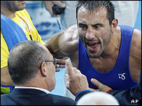 مراسم اهداء مدال کشتی فرنگی المپیک در وزن 84 کیلوگرم با جنجال انجام شد. آرا آبراهامیان، برنده مدال برنز در اعتراض به عملکرد داوران، مدال خود را به میان تشک پرتاب کرد و مراسم اهداء مدال را ترک نمود. این کشتی گیر سوئدی این اقدام را در اعتراض به عملکرد داوران در جریان دیدار نیمه نهایی این وزن، که میان او و آندرئا مینگوتزی (ایتالیا) برگزار شد، انجام داد. در مسابقه نیمه نهایی دست مینگوتزی در میان فریادهای اعتراض آمیز تماشاگران سوئدی به عنوان برنده اعلام شد، اما مربی آبراهامیان تصمیم برنده اعلام کردن کشتی گیر ایتالیایی را "سیاسی" خواند و گفت : "این تصمیم مفسدانه است." پس از مسابقه نیمه نهایی، آبراهامیان با عصبانیت به سمت داوران کنار تشک رفت و اطرافیان او مجبور شدند او را به زور کنترل کنند. این کشتی گیر که مقام نایب قهرمانی المپیک آتن را در اختیار داشت، پس از این حادثه با قاطعیت مسابقه رده بندی را برد و به مدال برنز دست یافت.