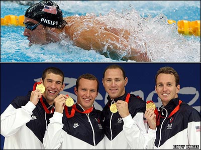 این تصویر در تاریخ ثبت خواهد شد. مایکل فلپس (بالا و چپ) با کمک سه شناگر آمریکایی دیگر موفق شد مدال طلای 4*100 متر مختلط امدادی را کسب کند تا پس از 36 سال رکورد تعداد مدالهای طلای کسب شده در یک المپیک که به مارک اشپیتز تعلق داشت، شکسته شود.