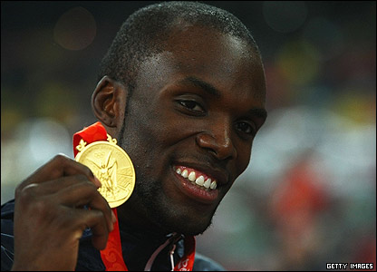 شادمانی لاشون مریت، دونده آمريکایی پس از کسب مدال طلا در رشته 400 متر مردان.