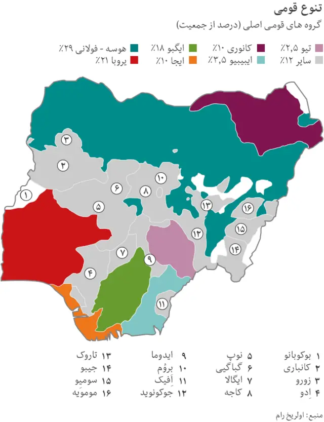 جمعیت ۱۶۰ میلیونی نیجریه نیز از نظر قومیت و زبان چندپاره است. قوم هوسه-فولانی در شمال کشور، عمدتا مسلمان هستند و یاروکوبا در جنوب غربی، بعضی مسلمان و بعضی مسیحیند. قوم ایگبو در شمال شرقی زندگی می کنند. بیشتر پیکارجویان بوکوحرام از قوم کانوریس هستند.