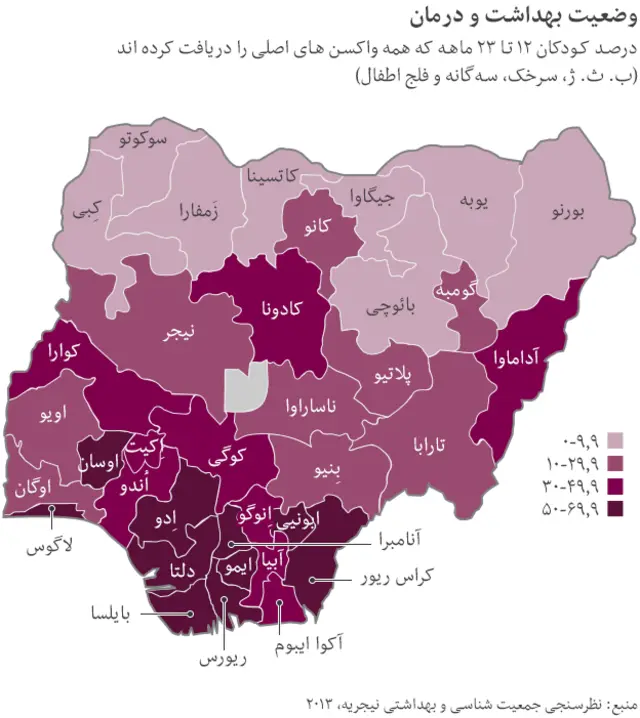 کمترین میزان واکسیناسیون کودکان در نیجریه را در نیمه شمالی کشور می بینیم. در ایالت سوکوتو در شمال غربی، تنها ۱.۴ درصد از کودکان ۱۲ تا ۲۳ ماهه واکسن های اصلی را دریافت کرده اند.