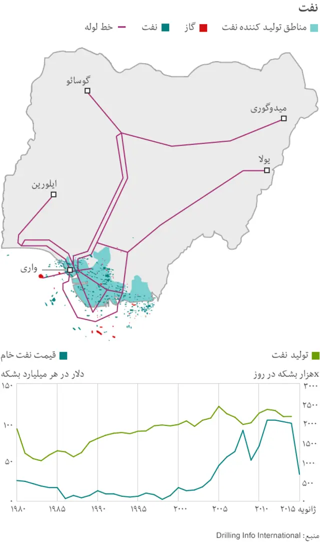نفت و گاز ۳۵ درصد تولید ناخالص داخلی نیجریه را تشکیل می دهد و ۷۰ درصد مخارج دولت از این محل تأمین می شود. بنزین و محصولات مشابه ۹۰ درصد از درآمد کشور را از محل صادرات به خود اختصاص می دهد. کاهش اخیر در قیمت نفت دولت را مجبور کرده تا در بودجه خود تجدیدنظر کند و ارقام پیش بینی شده از میزان رشد را کاهش دهد. برای اولین بار از سال ۱۹۹۹ درآمد دولت نیجریه رو به کاهش است و ارزش پول ملی یعنی نایرا در حال تنزل است.