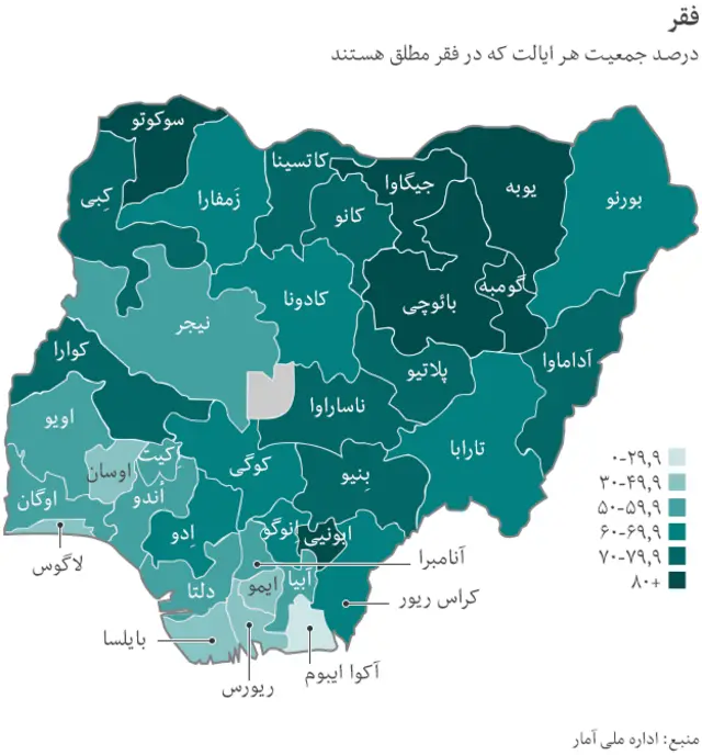 در شمال کشور وضعیت بدتر است. ایالت جیگاوا بالاترین میزان فقر را دارد که معادل ۸۸.۵ درصد و در سوکوتو این رقم ۸۶ درصد است.