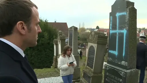 در ویدیویی که از دیدار امانوئل مکرون از این قبرستان منتشر شده رییس جمهوری فرانسه با عصبانیت در میان سنگ قبرهایی قدم می زند که با اسپری روی آنها صلیب شکسته نازی کشیده شده است.