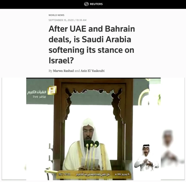 مروا راشد و عزیز الیعقوبی در گزارشی مشترک که روز سهشنبه، ۱۵ سپتامبر، برای خبرگزاری رویترز تهیه کردهاند از ملایم شدن لحن عربستان در مواجهه با اسرائیل به عنوان نشانهای مهم از تاثیرات برقراری رابطه میان اسرائیل و امارات و بحرین نوشتهاند و سخنان عبدالرحمن السدیس، امام جمعه سرشناس مسجداالحرام را هم گواهی بر این ارزیابی دانستهاند.