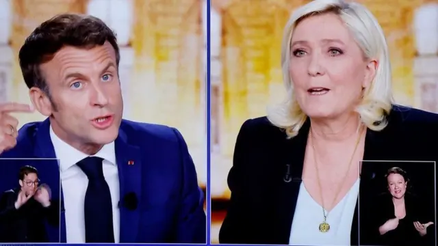 امانوئل مکرون این انتخابات را "همهپرسی در مورد اروپا" خواند و استدلال کرد که اروپا از فرانسه در برابر بحرانها و جنگ محافظت میکند و رقیب خود را متهم کرد که میخواهد از اتحادیه اروپا با "فرگزیت" خارج شود بدون اینکه جرأت بیان آن را داشته باشد.
