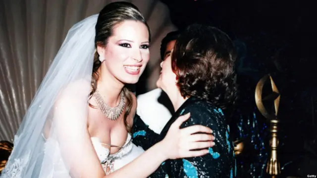 صفیه همسر سرهنگ قذافی در یک جشن عروسی . این عکس در میان عکس های خانودگی قذافی یافت شده است.