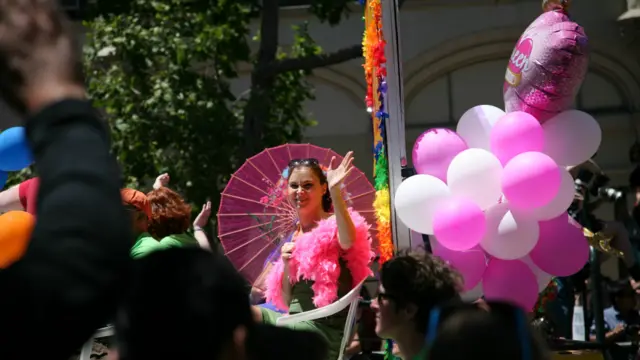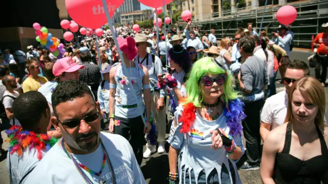 توضیح تصویر، چهل و دومین رژه سالانه همجنسگرایان امسال همچون چند دهه گذشته در شهر سانفرانسیسکو ایالت کالیفرنیا برگزارشد