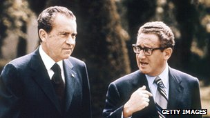 کیسینجر ( نفر سمت راست) روابط تنش آلودی با نیکسون داشت ولی بعدا وزیر خارجه دولت او شد