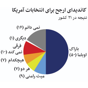 البته اکثریت پاسخدهندگان طرفدار هیچ یک از دو نامزده نبودهاند و ۱۴درصد آنها هوادار ریاستجمهوری رامنی و تنها ۱۱درصد حامی اوباما بودهاند.