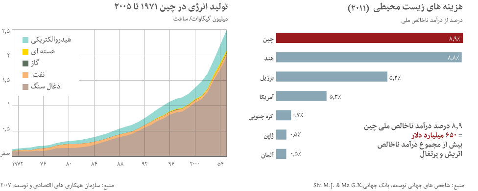 این اقدامات خالی از هزینه های زیست محیطی نبوده است؛ آلودگی محیطی به ویژه در اثر فعالیت نیروگاه های ذغال سنگی تشدید شده است. هزینه های زیست محیطی که در نمودار سمت راست در بالا نشان داده شده معیاری برای اندازه گیری هزینه های مالی آلودگی و استفاده از منابع طبیعی تجدیدناپذیر است.