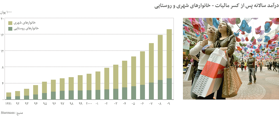 رشد سریع اقتصاد چین سبب افزایش قابل توجه ثروت مردم این کشور شده است. رشد ثروت بویژه در شهرها که دستمزد کارگران افزایش شدیدی داشته بیشتر دیده می شود و سبب شده است سطح درآمد پس از مالیات و قدرت خرید افزایش یابد. درآمد جمعیت در مناطق روستایی نیز رشد کرده اما رشد آن به اندازه مناطق شهری نبوده است.