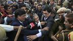 • نیروهای پلیس، مردم خشمگین را از یکی از مقام های رسمی دهلی که برای شرکت در مراسم سوگواری برای این زن حاضر شده، دور می کنند