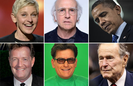 چهره های محبوب دورنر در جهت عقربههای ساعت از چپ: اِلن، لری دیوید، باراک اوباما، جرج بوش (پدر)، چارلی شین و پیرز مورگان