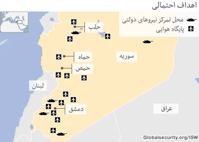 پیش بینی شده است که نیروهای حزب الله لبنان تحت حمایت ایران که همراه با نیروهای سوری به نبرد علیه شورشیان ادامه می دهند ممکن است در واکنش به حمله غرب، اسرائیل را هدف حمله موشکی قرار دهند.