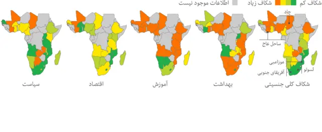 بعضی از کشورهایی که بیشترین شکاف جنسیتی در آنها وجود دارد در این منطقه هستند. چاد و ساحل عاج هر دو نزدیک به انتهای فهرست قرار دارند.
