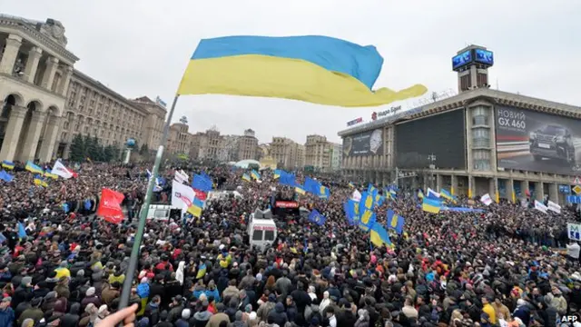 هزاران نفر از مردم اوکراین که طرفدار پیوستن کشورشان به اتحادیه اروپا بودند، در کیف، پایتخت به خیابانها آمدند. شمار تظاهرکنندگان در تاریخ ۲۴ نوامبر به بیش از یک صد هزار نفر رسید. تقاضای آنها این بود که ویکتور یانوکوویچ، رئیس جمهوری اوکراین تصمیم خود را تغییر دهد و برنامه نزدیک شدن بیشتر به اتحادیه اروپا را دنبال کند. ولی او از قبول این تقاضا خودداری کرد و در نتیجه تظاهرات ادامه یافت.