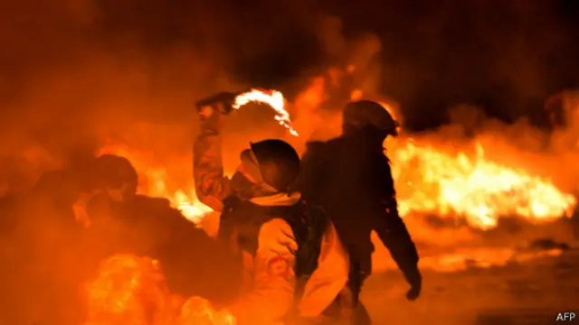 یکی از خبرنگاران بیبیسی در کیف میگوید معترضان لاستیک خودروها را آتش میزنند و در شهر شعلههای بزرگ آتش به چشم میخورد.