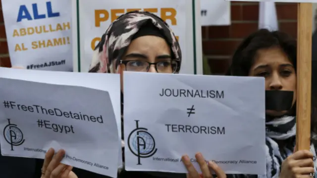 مقامات مصر این که محاکمه متهمان حمله به آزادی بیان در مصر است را رد می کنند و می گویند خبرنگاران شبکه خبری الجزیره جواز خبرنگاری نداشته و در نتیجه به طور غیرقانونی کار می کردند.