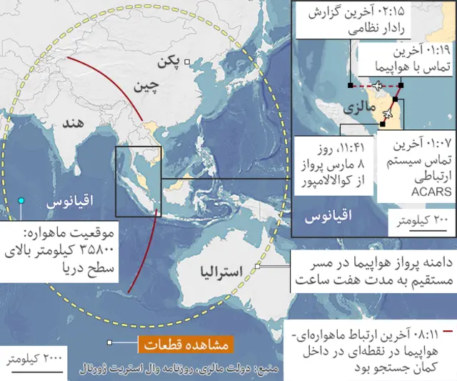 هواپیماها و کشتیهایی که برای مشاهده قطعات احتمالی هواپیمای مالزیایی ناپدید شده در اقیانوس هند سرگرم تجسس بودند هم روز پنجشنبه (۲۰ مارس) موفق نشدند آثاری از آن پیدا کنند.