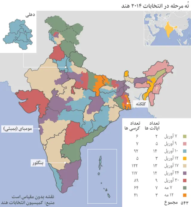 انتخابات ۹ مرحلهای هند که روز هفتم آوریل آغاز شده، ۱۲ مه تمام میشود و رایها روز ۱۶ مه شمارش خواهد شد.