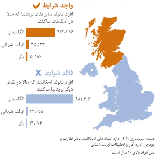 این یعنی ۸۰۰ هزار اسکاتلندی ساکن در بخشهای دیگر بریتانیا نمیتوانند در این همهپرسی شرکت کنند، در حالی که ۴۰۰ هزار بریتانیایی غیر اسکاتلندی که در آنجا ساکنند میتوانند.
