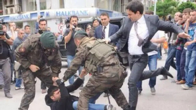 لحظه ای که یوسف یرکل، یکی از مشاوران نخست وزیر با لگد به یکی از معترضین که بر روی زمین افتاده بود حمله کرد توسط عکاسی شکار شد و در مطبوعات ترکیه و بین المللی منتشر شد. آقای یرکل بعدا عذرخواهی کرد، اما تصویر او بسیاری از اهالی ترکیه را خشمگین کرد.