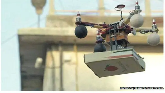 طبق <link type="page"><caption> گزارش "اکونومیک تایمز"</caption><url href="http://economictimes.indiatimes.com/industry/services/hotels-/-restaurants/mumbai-pizza-delivery-drones-raise-security-buzz/articleshow/35486155.cms" platform="highweb"/></link> ، روزنامه انگلیسی زبان چاپ هند، پیتزافروشی فرانسسکو می گوید که با موفقیت توانسته از یک هواپیمای کوچک چهار ملخه بدون سرنشین، برای تحویل پیتزا به یک مشتری استفاده کند که در آسمانخراشی ساکن بوده است. این محل در فاصله حدود یک و نیم کیلومتری رستوران قرار داشته و هواپیما با استفاده از کنترل از راه دور هدایت می شده است.