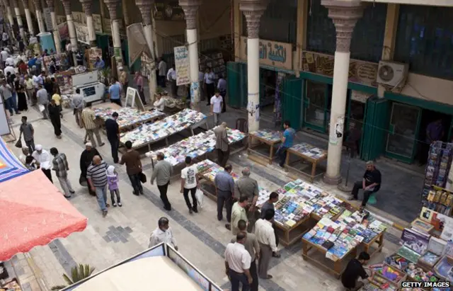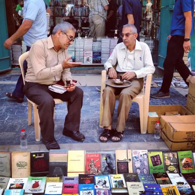 بازار کتاب درجنوب مرکز شهر بغداد یکی از نمادهای شادی بخش استقامت روحیه انسانی است. کتابفروشان کتابهای خود از دنیای ادبیات و هر آنچه را که آموختنی است، روی پیاده رو و حتی تا وسط گذرگاههای این بازار پهن می کنند.