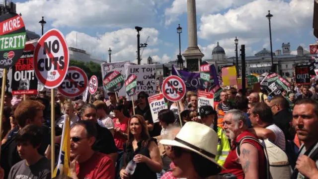 مخالفان دولت ائتلافی احزاب محافظهکار و لیبرال دموکرات بریتانیا از جمله با سیاست کاهش بودجه نهادهای عمومی مخالفت کردند.