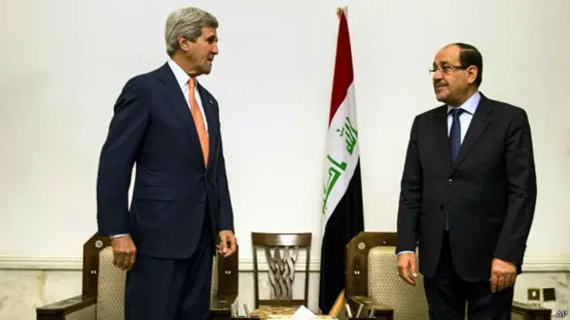 آقای کری با نوری مالکی، نخستوزیر دیدار کرد. برخی گروههای سنی آقای مالکی شیعه را به اتخاذ سیاستهای فرقهگرایانه متهم میکنند. واشنگتن خواهان این است که بغداد منافع بخشهای بیشتری از جامعه عراق را نمایندگی کند.